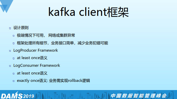 如上图我们提供三个组合接口,如果在业务处理与 Commit 中实现了业务端 Rollback 逻辑, 那么就是 exactly once 语义,默认是 at least once 语义。之前讲过 Kafka 本身提供 Replica+ISR 的机制来保证数据高可用,但我们觉得这个可能还不够,所以我们还要支持 Rack Aware。