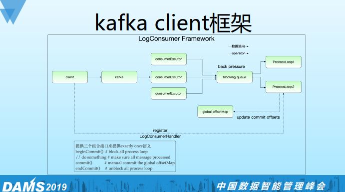 比如 Worker 处理不过来了,这时候 Blocking Queue 就会满,反压到 Consumer 线程会停止消费。同时我们在 Worker 线程接口里面会提供接口让用户提交到 global offsetmap。