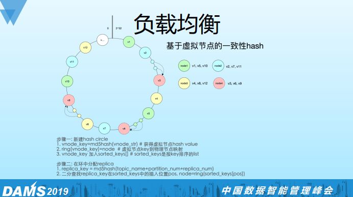 ①新建 hash circle:通过 vnode_str(比如 hostname-v0)做一个 MD5 的 Hash,得到虚拟节点的 vnode_key,再用 ring 字典来保存虚拟节点到物理节点的映射,同时将 vnode_key 加入到 sorted_keys 的 list 中。②在 Hash 环中分配 Replica:将(topic_name+partition_num+replica_num)作为 Key 用相同的 MD5 Hash 算法得到 replica_key。