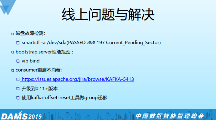 磁盘故障:我们通过 Smartctl 来监测,首先状态是要 Passed 的,其次我们会判断 197 Current_Pending_Sector 这个属性值不能大于 100, 如果大于 100 这个磁盘可能有读写性能问题。bootstrap.servers 性能瓶颈:该参数可以配置多台 Broker,这些 Broker 作为 Proxy 的角色为 Kafka Clients 提供 Lookup 服务。