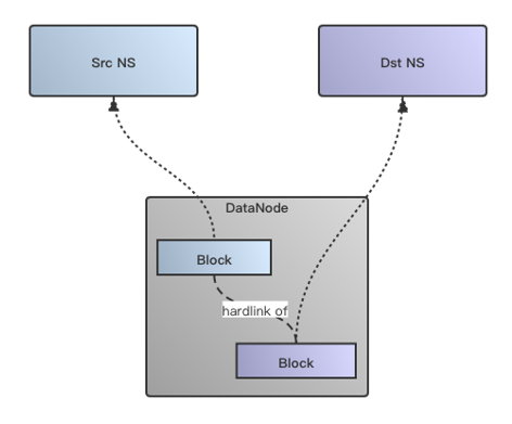 鉴于我们的集群处于HDFS Federation模式,下面的DN存储是共享的,所以并没有必要在物理数据层面进行拷贝。于是我们Backport了社区HDFS-2139 (HDFS-2139:Fast copy for HDFS)的改动到我们内部版本中。Fastcopy的拷贝过程与原始数据拷贝方式的最大区别在于物理数据是通过建立hardlink的方式来做,省去了实际数据拷贝的过程,以此大大缩短数据拷贝的时间,原理图如下所示:图1(点击可查看大图)