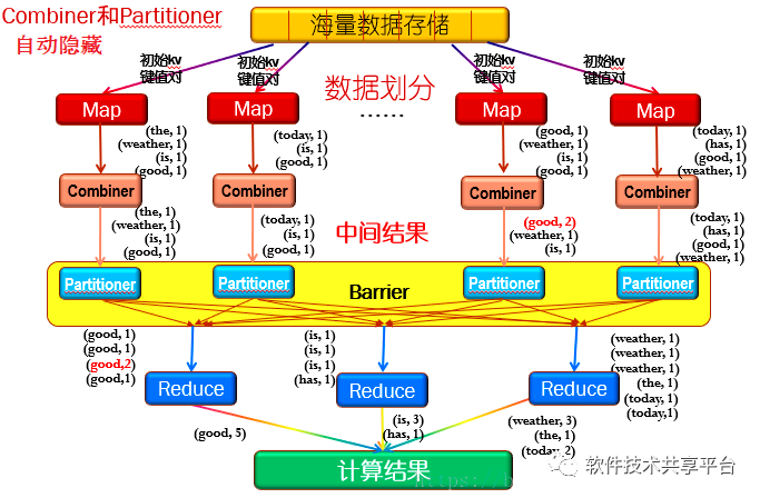 (6)溢写线程启动后,需要对这80MB空间内的key做排序(Sort)。排序是MapReduce模型默认的行为。如果job设置过Combiner,那么现在就是使用Combiner的时候了。将有相同key的key/value对的value加起来,减少溢写到磁盘的数据量。Combiner会优化MapReduce的中间结果,所以它在整个模型中会多次使用。