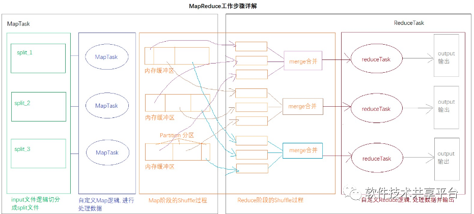 它分布在Mapreduce的map阶段和reduce阶段。一般把从Map产生输出开始到Reduce取得数据作为输入之前的过程称作shuffle。