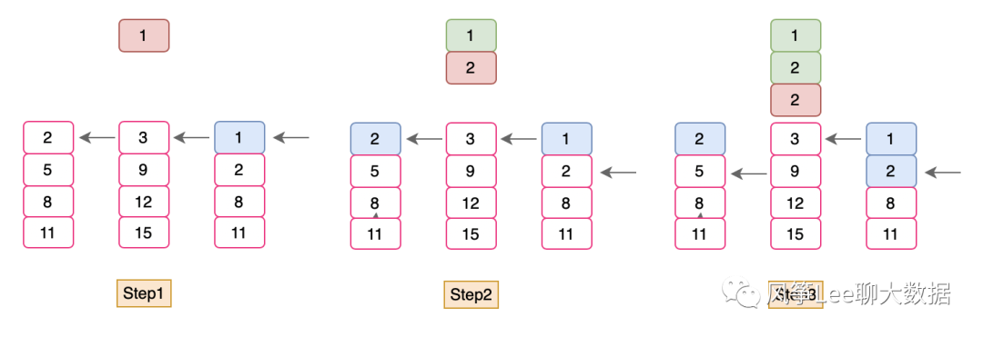 可以使用多路归并算法进行实现。对每个文件设计一个指针,取出K个指针中数值最小的一个,然后把最小的那个指针后移,接着继续找K个指针中数值最小的一个,继续后移指针……直到N个文件全部读完为止。如下图示例所示:
