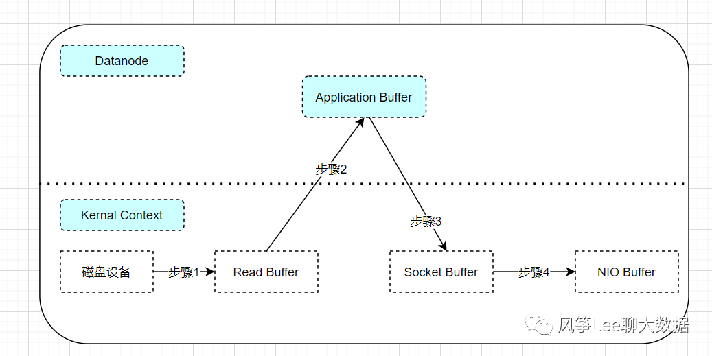 传统的文件IO操作,都是调用操作系统提供的系统调用函数read()或write()来执行读写操作,当前进程会由用户态切换到内核态,然后操作系统的内核代码负责将响应的文件数据读取到内核的IO缓冲区,最后再把数据从内核IO缓存区拷贝到进程的私有地址空间,完成一次IO操作。Datanode读取数据的操作如下图所示: