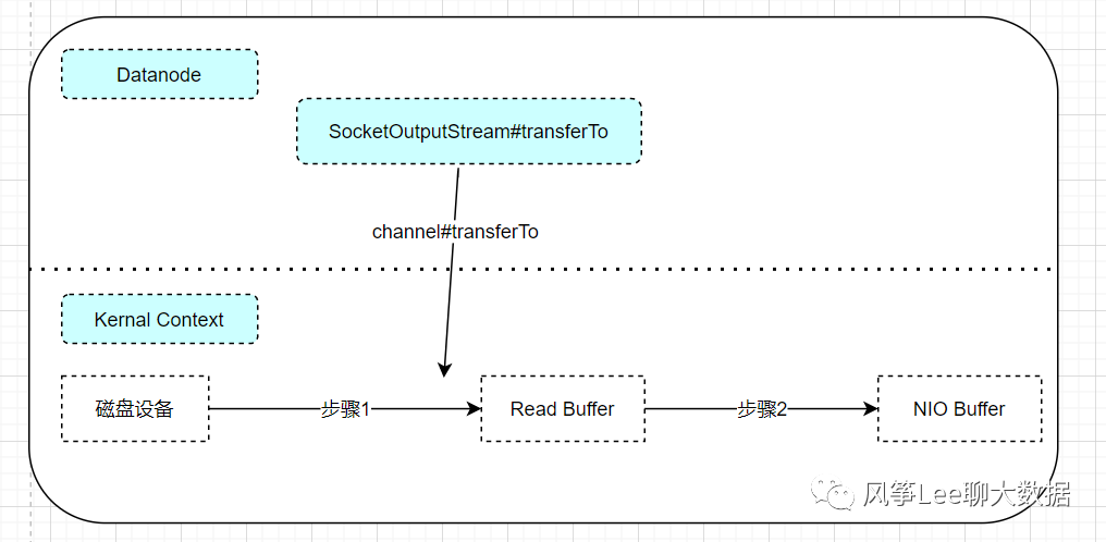 使用零拷贝模式除了降低数据拷贝的次数外, 上下文切换次数也从4次降低到了2次。当Datanode调用transferTo()方法时会发生用户态到内核态的切换,transferTo()方法执行完毕返回时内核态又会切换回用户态。