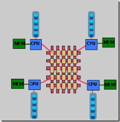 和 NUMA 不同, MPP 提供了另外一种进行系统扩展的方式,它由多个 SMP 服务器通过一定的节点互联网络进行连接,协同工作,完成相同的任务,从用户的角度来看是一个服务器系统。其基本特征是由多个 SMP 服务器 ( 每个 SMP 服务器称节点 ) 通过节点互联网络连接而成,每个节点只访问自己的本地资源 ( 内存、存储等 ) ,是一种完全无共享 (Share Nothing) 结构,因而扩展能力最好,理论上其扩展无限制,目前的技术可实现 512 个节点互联,数千个 CPU 。目前业界对节点互联网络暂无标准,如 NCR 的 Bynet , IBM 的 SPSwitch ,它们都采用了不同的内部实现机制。但节点互联网仅供 MPP 服务器内部使用,对用户而言是透明的。