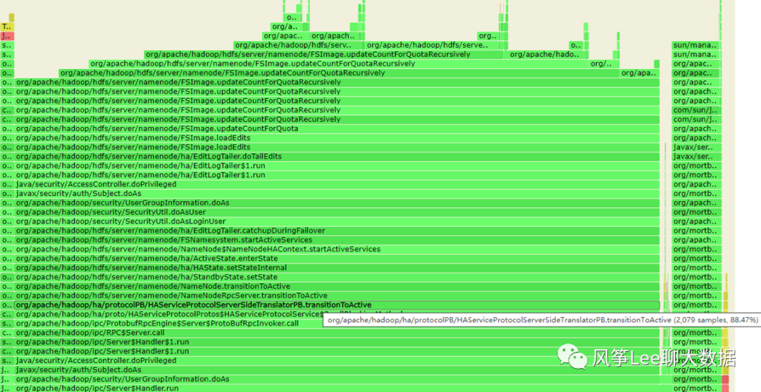 可见namenode端处理transitionToActive请求的调用过程和主要耗时情况,几乎全部耗时都花费在了FsImage.updateCountForQuotaRecursively方法上;