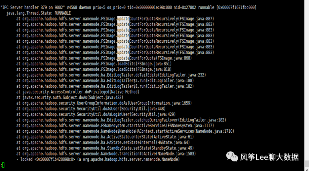 梳理具体的代码逻辑: namenode端处理zkfc transitionToActive切换状态请求,需要保证所有的editlog已加载完成,并调用递归方法updateCountForQuotaRecursively更新整个fsimage下的配额和使用量信息,因为现在逻辑是单线程递归更新,在fsimage 比较大情况下处理会比较慢。