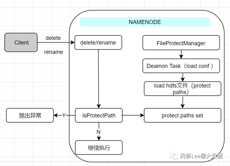 功能设计比较简单,配置指定的hdfs文件来维护所有需要保护的重点目录,后台守护线程进行异步刷新,namenode端执行delete、mv操作时会进行效验,效验失败则抛出异常。