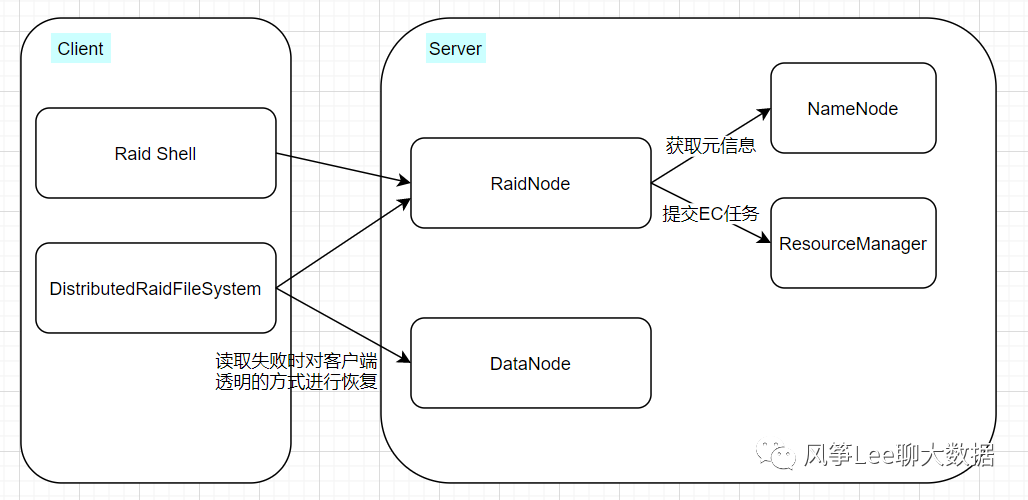 HDFS-RAID是Facebook基于hadoop-20-append分支(第一代Hadoop)开发的raid方案,但是由于HDFS-RAID方案本身是为集成到Hadoop老版本中设计的,集成到Hadoop2.7.2版本中涉及到代码一些兼容问题和bug修改问题,HDFS-RAID的实现架构如下图。