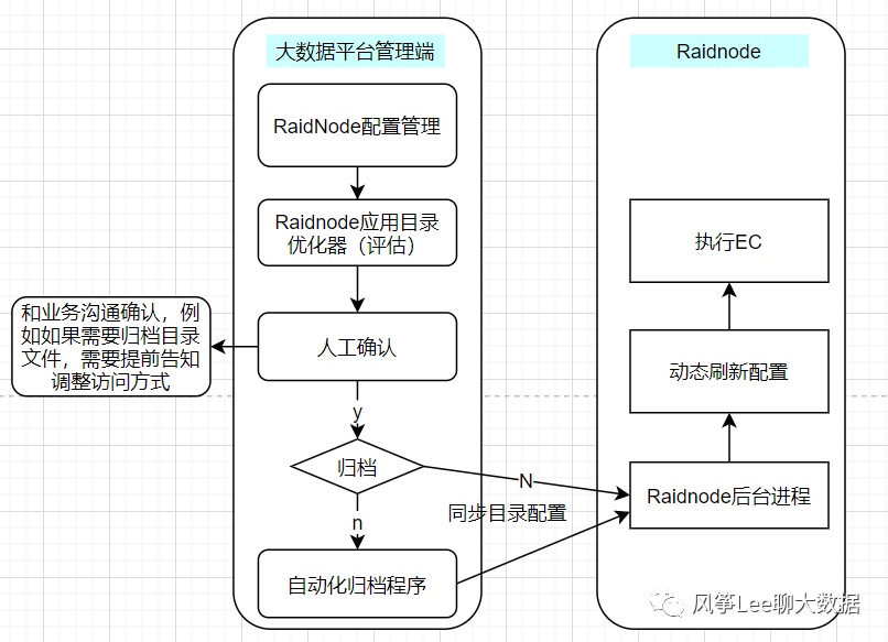 集成到hadoop2.7.2版本中发现了一些api不兼容和需要修改bug的地方,例如应用过程中发现线上hdfs集群开启blocktoken的情况下出现恢复失败问题,排查发现HDFS-RAID修复坏块逻辑需要获取当前Block的Write Mode的BlockToken,所以在namenode端新增了获取Write Mode的BlockToken Rpc方法,诸如此类,最后集成到我们的版本中。线上集群应用HDFS-RAID功能后对业务一些历史冷数据目录应用了EC功能,节省了大量的存储成本,同时也能保证坏盘导致的missing block的及时修复功能,可靠性方面有一定的保障。应用过程中发现HDFS-RAID功能只会对大文件做EC(至少包含三个block,由于其实现原理导致的,默认实现算法为RS(5,3)),我们通过对历史冷数据中的小文件进行hadoop archive后,再应用HDFS-RIAD功能,目前考虑的应用流程设计如下图(只是相关设计,还未具体应用)。如果业务冷数据目录存在大量的小文件,目前是通过人工方式进行检测、确认和指定归档程序、刷新配置到Raidnode。