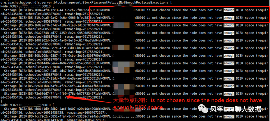 1. datanodeIP:50010 is not chosen since the node does not have enough DISK space : 当时大量的节点存储已无可用空间,为不可选节点,所有这些节点上负载几乎为0;