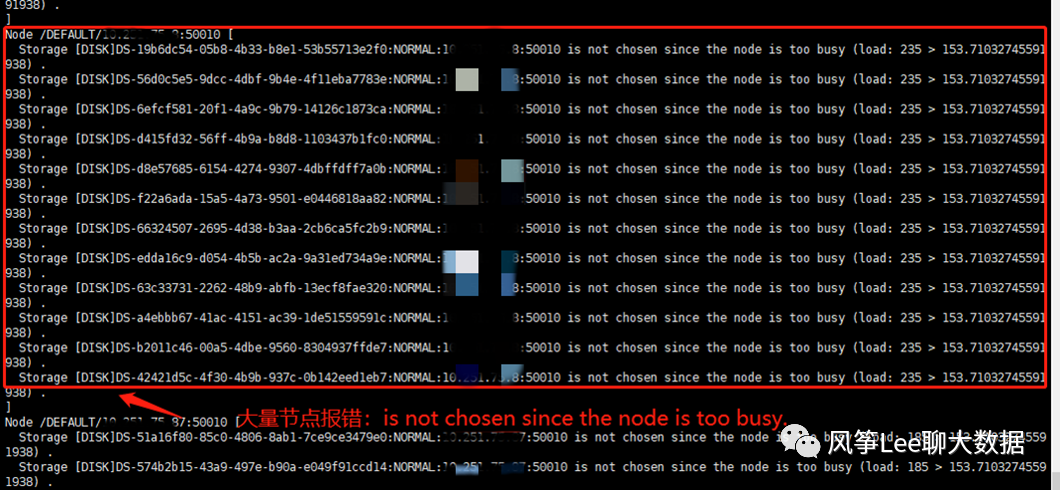 2. datanodeIP:50010 is not chosen since the node is too busy : 验证逻辑的第五条,如果dn节点的active xceiver 数量超过了集群平均值的两倍就认为是不可选节点, 当时acitve xceiver线程数为76,远远没有达到配置值1024,且这些节点磁盘和网络io未发现过高问题,所以认为是逻辑问题导致的误报不可用节点;