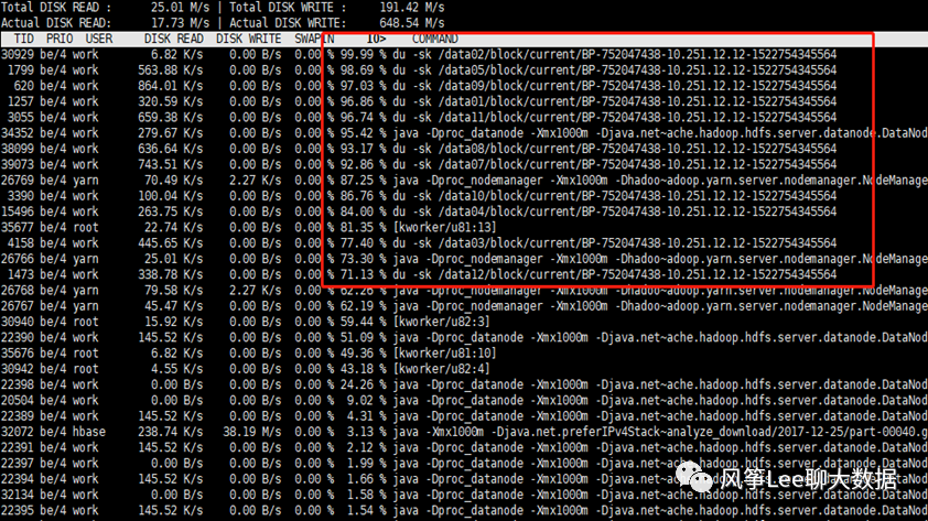 为了计算DN的capacity使用量,DN会针对其配置的每块盘路径进行du操作,然后将数据汇报到NN中,为了保证数据使用量统计的近实时性,默认du间隔为10min,所以对于DN来说,默认的Du会产生大量的du-sk的操作,会造成集群严重的IO Wait增加,从而导致读写会变得缓慢。