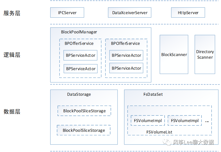 首先简单介绍下datanode逻辑结构、磁盘存储结构,逻辑结构主要分三层:服务层、逻辑层、数据层,如下图所示,