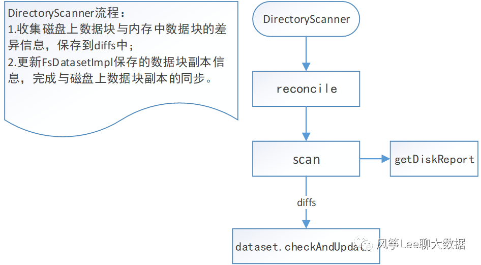 DirectoryScanner:目录扫描服务,定期扫描磁盘上的数据块,检查磁盘上的数据块信息是否与FsDatasetImpl中保存的数据块信息一致,如果不一致则对FsDatasetImpl中的信息进行更新,执行流程如下图。