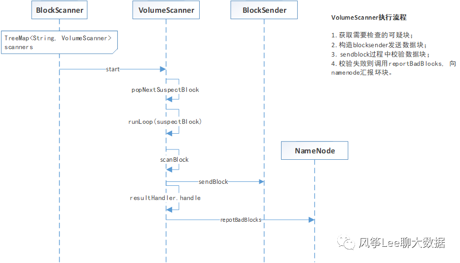 每个datanode都会初始化一个数据块扫描器周期性地验证Datanode上存储的所有数据块的正确性(数据块校验),并把发现的损坏数据块报告给Namenode. 执行流程如下图。