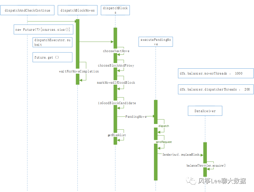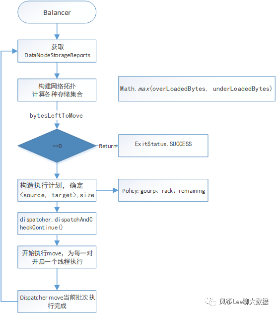 HDFS Balancer机制可以使各个datanode数据节点间进行数据balance,执行流程如下图: