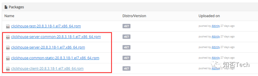 #安装[root@nn72 clickhouse]# lltotal 103412-rw-r--r-- 1 root root 6384 Oct 6 06:32 clickhouse-client-20.8.3.18-1.el7.x86_64.rpm-rw-r--r-- 1 root root 69093220 Oct 6 06:32 clickhouse-common-static-20.8.3.18-1.el7.x86_64.rpm-rw-r--r-- 1 root root 36772044 Oct 6 06:36 clickhouse-server-20.8.3.18-1.el7.x86_64.rpm-rw-r--r-- 1 root root 14472 Oct 6 06:36 clickhouse-server-common-20.8.3.18-1.el7.x86_64.rpm[root@nn72 clickhouse]# rpm -ivh *.rpmPreparing... ################################# [100%]Updating installing...1:clickhouse-server-common-20.8.3.1################################# [ 25%]2:clickhouse-common-static-20.8.3.1################################# [ 50%]3:clickhouse-server-20.8.3.18-1.el7################################# [ 75%]Create user clickhouse.clickhouse with datadir var/lib/clickhouse4:clickhouse-client-20.8.3.18-1.el7################################# [100%]Create user clickhouse.clickhouse with datadir var/lib/clickhouse[root@nn72 clickhouse]##启动[root@nn72 clickhouse]# service clickhouse-server startStart clickhouse-server service: Path to data directory in etc/clickhouse-server/config.xml: var/lib/clickhouse/DONE[root@nn72 clickhouse]# netstat -anlp |grep 9000tcp 0 0 127.0.0.1:9000 0.0.0.0:* LISTEN 219452/clickhouse-stcp6 0 0 ::1:9000 :::* LISTEN 219452/clickhouse-s[root@nn72 clickhouse]##登录客户端连接server[root@nn72 clickhouse]# clickhouse-clientClickHouse client version 20.8.3.18.Connecting to localhost:9000 as user default.Connected to ClickHouse server version 20.8.3 revision 54438.nn72.hdp71.unicom :)