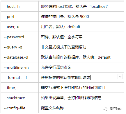 #client 示例#-q 非交互模式[root@nn72 clickhouse]# clickhouse-client -q 'show databases;'_temporary_and_external_tablesdefaultsystem[root@nn72 clickhouse]##-d指定数据库[root@nn72 clickhouse]# clickhouse-client -d systemClickHouse client version 20.8.3.18.Connecting to database system at localhost:9000 as user default.Connected to ClickHouse server version 20.8.3 revision 54438.nn72.hdp71.unicom :) show tables;SHOW TABLES┌─name───────────────────────────┐│ aggregate_function_combinators ││ asynchronous_metric_log ││ asynchronous_metrics ││ build_options ││ clusters ││ collations ││ columns ││ contributors ││ current_roles ││ data_type_families ││ databases ││ detached_parts ││ dictionaries ││ disks ││ distribution_queue ││ enabled_roles ││ events ││ formats ││ functions ││ grants ││ graphite_retentions ││ licenses ││ macros ││ merge_tree_settings ││ merges ││ metric_log ││ metrics ││ models ││ mutations ││ numbers ││ numbers_mt ││ one ││ parts ││ parts_columns ││ privileges ││ processes ││ query_log ││ query_thread_log ││ quota_limits ││ quota_usage ││ quotas ││ quotas_usage ││ replicas ││ replication_queue ││ role_grants ││ roles ││ row_policies ││ settings ││ settings_profile_elements ││ settings_profiles ││ stack_trace ││ storage_policies ││ table_engines ││ table_functions ││ tables ││ time_zones ││ trace_log ││ user_directories ││ users ││ zeros ││ zeros_mt │└────────────────────────────────┘61 rows in set. Elapsed: 0.003 sec.nn72.hdp71.unicom :)#-m 多行执行[root@nn72 clickhouse]# clickhouse-client -mClickHouse client version 20.8.3.18.Connecting to localhost:9000 as user default.Connected to ClickHouse server version 20.8.3 revision 54438.nn72.hdp71.unicom :) show:-] databases;SHOW DATABASES┌─name───────────────────────────┐│ _temporary_and_external_tables ││ default ││ system │└────────────────────────────────┘3 rows in set. Elapsed: 0.002 sec.nn72.hdp71.unicom :)#多行模式退出nn72.hdp71.unicom :) quit:-] ;Bye.#非交互式,-t 显示执行时间[root@nn72 clickhouse]# clickhouse-client -t -q "show databases;"_temporary_and_external_tablesdefaultsystem0.003[root@nn72 clickhouse]##server 关闭[root@nn72 ~]# service clickhouse-server stopStop clickhouse-server service: DONE