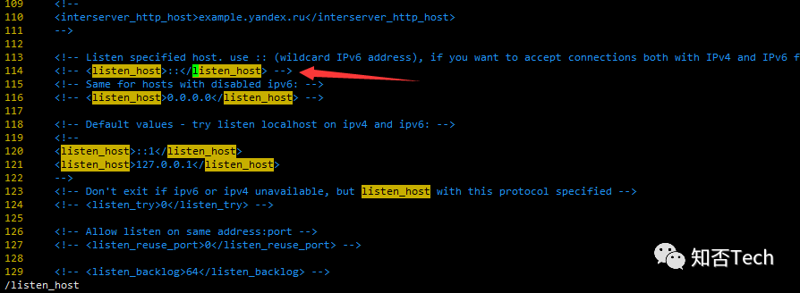#修改后<!-- Listen specified host. use :: (wildcard IPv6 address), if you want to accept connections both with IPv4 and IPv6 from everywhere. --><listen_host>::</listen_host><!-- Same for hosts with disabled ipv6: --><!-- <listen_host>0.0.0.0</listen_host> --><!-- Default values - try listen localhost on ipv4 and ipv6: --><!--<listen_host>::1</listen_host><listen_host>127.0.0.1</listen_host>