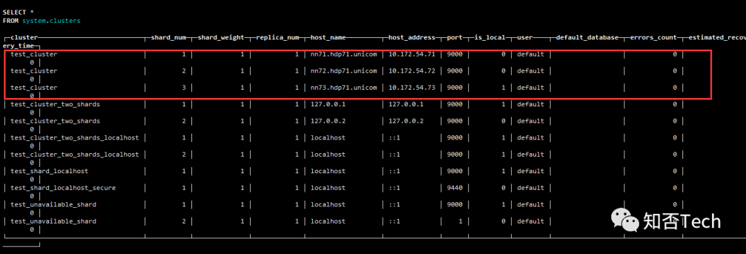 #启动集群(所有节点)[root@nn73 ~]# service clickhouse-server startStart clickhouse-server service: Path to data directory in etc/clickhouse-server/config.xml: var/lib/clickhouse/DONE#验证集群配置[root@nn73 ~]# clickhouse-clientClickHouse client version 20.8.3.18.Connecting to localhost:9000 as user default.Connected to ClickHouse server version 20.8.3 revision 54438.nn73.hdp71.unicom :) select * from system.clustersSELECT *FROM system.clusters┌─cluster───────────────────────────┬─shard_num─┬─shard_weight─┬─replica_num─┬─host_name─────────┬─host_address─┬─port─┬─is_local─┬─user────┬─default_database─┬─errors_count─┬─estimated_recovery_time─┐│ test_cluster │ 1 │ 1 │ 1 │ nn71.hdp71.unicom │ 10.172.54.71 │ 9000 │ 0 │ default │ │ 0 │ 0 ││ test_cluster │ 2 │ 1 │ 1 │ nn72.hdp71.unicom │ 10.172.54.72 │ 9000 │ 0 │ default │ │ 0 │ 0 ││ test_cluster │ 3 │ 1 │ 1 │ nn73.hdp71.unicom │ 10.172.54.73 │ 9000 │ 1 │ default │ │ 0 │ 0 ││ test_cluster_two_shards │ 1 │ 1 │ 1 │ 127.0.0.1 │ 127.0.0.1 │ 9000 │ 1 │ default │ │ 0 │ 0 ││ test_cluster_two_shards │ 2 │ 1 │ 1 │ 127.0.0.2 │ 127.0.0.2 │ 9000 │ 0 │ default │ │ 0 │ 0 ││ test_cluster_two_shards_localhost │ 1 │ 1 │ 1 │ localhost │ ::1 │ 9000 │ 1 │ default │ │ 0 │ 0 ││ test_cluster_two_shards_localhost │ 2 │ 1 │ 1 │ localhost │ ::1 │ 9000 │ 1 │ default │ │ 0 │ 0 ││ test_shard_localhost │ 1 │ 1 │ 1 │ localhost │ ::1 │ 9000 │ 1 │ default │ │ 0 │ 0 ││ test_shard_localhost_secure │ 1 │ 1 │ 1 │ localhost │ ::1 │ 9440 │ 0 │ default │ │ 0 │ 0 ││ test_unavailable_shard │ 1 │ 1 │ 1 │ localhost │ ::1 │ 9000 │ 1 │ default │ │ 0 │ 0 ││ test_unavailable_shard │ 2 │ 1 │ 1 │ localhost │ ::1 │ 1 │ 0 │ default │ │ 0 │ 0 │└───────────────────────────────────┴───────────┴──────────────┴─────────────┴───────────────────┴──────────────┴──────┴──────────┴─────────┴──────────────────┴──────────────┴─────────────────────────┘