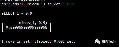 #浮点数计算有可能出现四舍五入的误差nn73.hdp71.unicom :) select 1-0.9SELECT 1 - 0.9┌───────minus(1, 0.9)─┐│ 0.09999999999999998 │└─────────────────────┘1 rows in set. Elapsed: 0.002 sec.