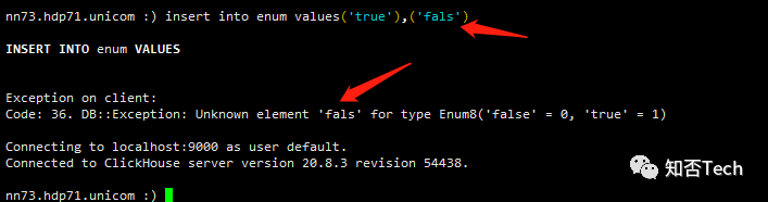 #枚举类型nn73.hdp71.unicom :) create table enum(boo Enum8('true'=1,'false'=0))engine=TinyLog;CREATE TABLE enum(`boo` Enum8('true' = 1, 'false' = 0))ENGINE = TinyLogOk.0 rows in set. Elapsed: 0.002 sec.nn73.hdp71.unicom :) insert into enum values('true'),('false')INSERT INTO enum VALUESOk.2 rows in set. Elapsed: 0.002 sec.nn73.hdp71.unicom :) select * from enum;SELECT *FROM enum┌─boo───┐│ true ││ false │└───────┘2 rows in set. Elapsed: 0.002 sec.#cast 转换查看enum的代表数值nn73.hdp71.unicom :) select cast(boo,'Int8') from enum;SELECT cast(boo, 'Int8')FROM enum┌─cast(boo, 'Int8')─┐│ 1 ││ 0 │└───────────────────┘4 rows in set. Elapsed: 0.002 sec.nn73.hdp71.unicom :)