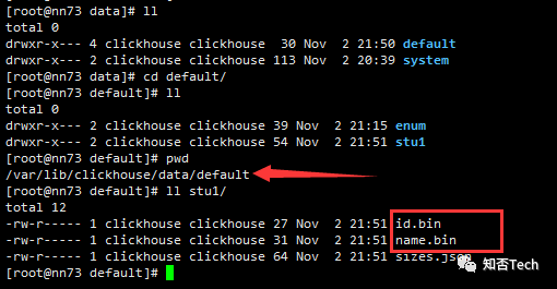 #查看数据目录,此处截图可以看出clickhouse是以列为存储的,分别存储的id列和name列,其中sizes.json是记录各列大小信息的。[root@nn73 default]# pwd/var/lib/clickhouse/data/default[root@nn73 default]# ll stu1/total 12-rw-r----- 1 clickhouse clickhouse 27 Nov 2 21:51 id.bin-rw-r----- 1 clickhouse clickhouse 31 Nov 2 21:51 name.bin-rw-r----- 1 clickhouse clickhouse 64 Nov 2 21:51 sizes.json