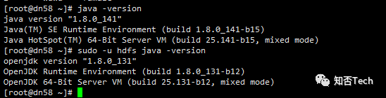 #此问题是由于sqoop用户与root用户的jdk版本不一致导致[root@dn58 ~]# sudo -u hdfs sqoop import --connect jdbc:mysql://10.172.54.58:3306/company --username root --password Admin@2020 --table staff --target-dir user/company --delete-target-dir >Warning: opt/cloudera/parcels/CDH-6.3.2-1.cdh6.3.2.p0.1605554/bin/../lib/sqoop/../accumulo does not exist! Accumulo imports will fail.Please set $ACCUMULO_HOME to the root of your Accumulo installation.SLF4J: Class path contains multiple SLF4J bindings.SLF4J: Found binding in [jar:file:/opt/cloudera/parcels/CDH-6.3.2-1.cdh6.3.2.p0.1605554/jars/slf4j-log4j12-1.7.25.jar!/org/slf4j/impl/StaticLoggerBinder.class]SLF4J: Found binding in [jar:file:/opt/cloudera/parcels/CDH-6.3.2-1.cdh6.3.2.p0.1605554/jars/log4j-slf4j-impl-2.8.2.jar!/org/slf4j/impl/StaticLoggerBinder.class]SLF4J: See http://www.slf4j.org/codes.html#multiple_bindings for an explanation.SLF4J: Actual binding is of type [org.slf4j.impl.Log4jLoggerFactory]20/10/27 20:52:39 INFO sqoop.Sqoop: Running Sqoop version: 1.4.7-cdh6.3.220/10/27 20:52:39 WARN tool.BaseSqoopTool: Setting your password on the command-line is insecure. Consider using -P instead.20/10/27 20:52:39 INFO manager.MySQLManager: Preparing to use a MySQL streaming resultset.20/10/27 20:52:39 INFO tool.CodeGenTool: Beginning code generation20/10/27 20:52:39 INFO manager.SqlManager: Executing SQL statement: SELECT t.* FROM `staff` AS t LIMIT 120/10/27 20:52:39 INFO manager.SqlManager: Executing SQL statement: SELECT t.* FROM `staff` AS t LIMIT 120/10/27 20:52:39 INFO orm.CompilationManager: HADOOP_MAPRED_HOME is opt/cloudera/parcels/CDH/lib/hadoop-mapreduce20/10/27 20:52:39 ERROR orm.CompilationManager: It seems as though you are running sqoop with a JRE.20/10/27 20:52:39 ERROR orm.CompilationManager: Sqoop requires a JDK that can compile Java code.20/10/27 20:52:39 ERROR orm.CompilationManager: Please install a JDK and set $JAVA_HOME to use it.20/10/27 20:52:39 ERROR tool.ImportTool: Import failed: java.io.IOException: Could not start Java compiler.at org.apache.sqoop.orm.CompilationManager.compile(CompilationManager.java:196)at org.apache.sqoop.tool.CodeGenTool.generateORM(CodeGenTool.java:107)at org.apache.sqoop.tool.ImportTool.importTable(ImportTool.java:515)at org.apache.sqoop.tool.ImportTool.run(ImportTool.java:633)at org.apache.sqoop.Sqoop.run(Sqoop.java:146)at org.apache.hadoop.util.ToolRunner.run(ToolRunner.java:76)at org.apache.sqoop.Sqoop.runSqoop(Sqoop.java:182)at org.apache.sqoop.Sqoop.runTool(Sqoop.java:233)at org.apache.sqoop.Sqoop.runTool(Sqoop.java:242)at org.apache.sqoop.Sqoop.main(Sqoop.java:251)