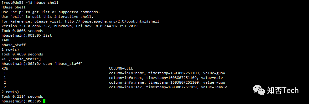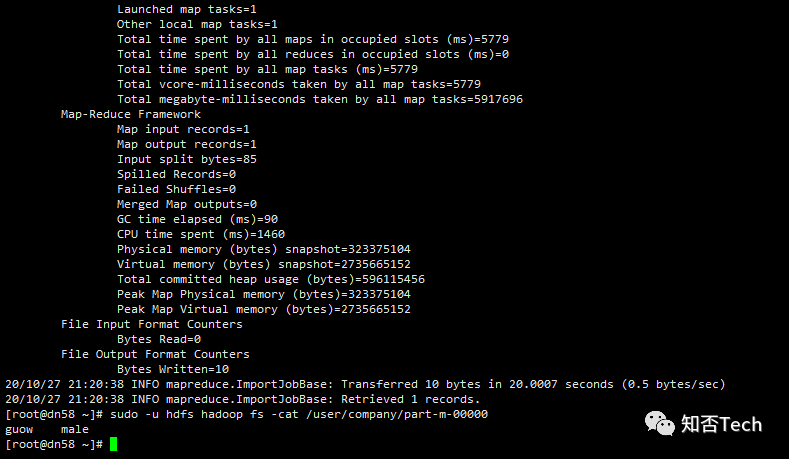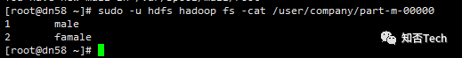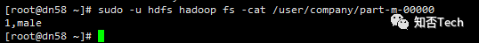 [root@dn58 ~]# sudo -u hdfs hadoop fs -cat /user/company/part-m-000001 guow male2 wuwu famale