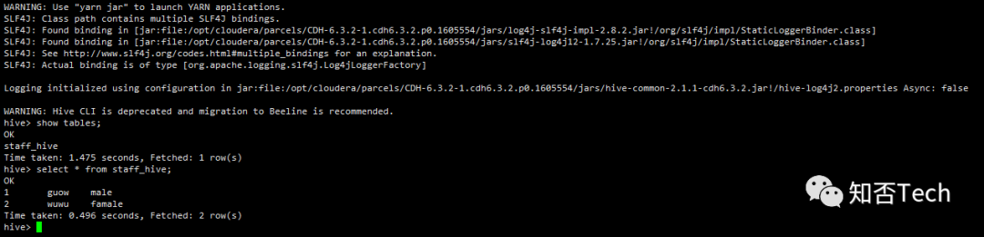 [root@dn58 mariadb-10.1.46-linux-systemd-x86_64]# sqoop list-databases --connect jdbc:mysql://10.172.54.58:3306/hive --username hive --password hive_2020Warning: opt/cloudera/parcels/CDH-6.3.2-1.cdh6.3.2.p0.1605554/bin/../lib/sqoop/../accumulo does not exist! Accumulo imports will fail.Please set $ACCUMULO_HOME to the root of your Accumulo installation.SLF4J: Class path contains multiple SLF4J bindings.SLF4J: Found binding in [jar:file:/opt/cloudera/parcels/CDH-6.3.2-1.cdh6.3.2.p0.1605554/jars/slf4j-log4j12-1.7.25.jar!/org/slf4j/impl/StaticLoggerBinder.class]SLF4J: Found binding in [jar:file:/opt/cloudera/parcels/CDH-6.3.2-1.cdh6.3.2.p0.1605554/jars/log4j-slf4j-impl-2.8.2.jar!/org/slf4j/impl/StaticLoggerBinder.class]SLF4J: See http://www.slf4j.org/codes.html#multiple_bindings for an explanation.SLF4J: Actual binding is of type [org.slf4j.impl.Log4jLoggerFactory]20/10/27 20:08:50 INFO sqoop.Sqoop: Running Sqoop version: 1.4.7-cdh6.3.220/10/27 20:08:50 WARN tool.BaseSqoopTool: Setting your password on the command-line is insecure. Consider using -P instead.20/10/27 20:08:50 INFO manager.MySQLManager: Preparing to use a MySQL streaming resultset.hiveinformation_schema