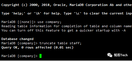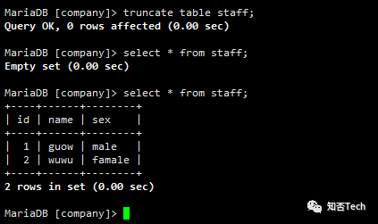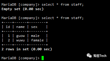 MariaDB [(none)]> create database company;Query OK, 1 row affected (0.00 sec)MariaDB [(none)]> create table company.staff(id int(4) primary key not null auto_increment,name varchar(255),sex varchar(255));Query OK, 0 rows affected (0.01 sec)MariaDB [(none)]> use company;Reading table information for completion of table and column namesYou can turn off this feature to get a quicker startup with -ADatabase changedMariaDB [company]> insert into company.staff(name,sex) values('guow','male');Query OK, 1 row affected (0.00 sec)MariaDB [company]> insert into company.staff(name,sex) values('wuwu','famale');Query OK, 1 row affected (0.00 sec)MariaDB [company]> select * from staff;+----+------+--------+| id | name | sex |+----+------+--------+| 1 | guow | male || 2 | wuwu | famale |+----+------+--------+2 rows in set (0.00 sec)