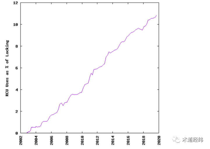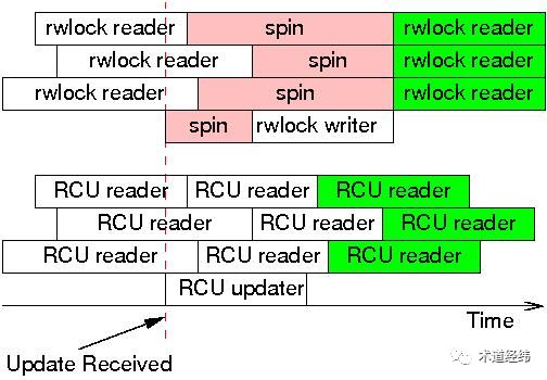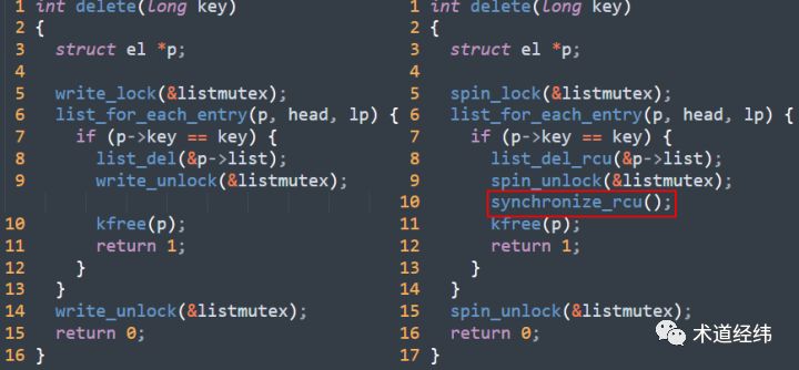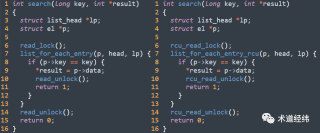 RCU机制是自内核2.5版本引入的(2002年10月),而后不断完善,其在Linux的locking机制中的使用占比也是逐年攀升。RCU的基本思想是这样的:先创建一个旧数据的copy,然后writer更新这个copy,最后再用新的数据替换掉旧的数据。这样讲似乎比较抽象,那么结合一个实例来看或许会更加直观。假设有一个单向链表,其中包含一个由指针p指向的节点:现在,我们要使用RCU机制来更新这个节点的数据,那么首先需要分配一段新的内存空间(由指针q指向),用于存放这个copy。然后将p指向的节点数据,以及它和下一节点[11, 4, 8]的关系,都完整地copy到q指向的内存区域中。接下来,writer会修改这个copy中的数据(将[5, 6, 7]修改为[5, 2, 3])。修改完成之后,writer就可以将这个更新“发布”了(publish),对于reader来说就“可见”了。因此,pubulish之后才开始读取操作的reader(比如读节点[1, 2, 3]的下一个节点),得到的就是新的数据[5, 2, 3](图中红色边框表示有reader在引用)。而在publish之前就开始读取操作的reader则不受影响,依然使用旧的数据[5, 6, 7]。等到所有引用旧数据区的reader都完成了相关操作,writer才会释放由p指向的内存区域。可见,在此期间,reader如果读取这个节点的数据,得到的要么全是旧的数据,要么全是新的数据,反正不会是「半新半旧」的数据,数据的一致性是可以保证的。重要的是,RCU中的reader不用像rwlock中的reader那样,在writer操作期间必须spin等待了。RCU的全称是"read copy update",可以这样来理解:read和进行copy的线程并行,目的是为了update。好像有点"copy on write"的意思?反正有人觉得RCU的命名不够准确,宁愿叫它"publish protocol"(比如 Fedor Pikus)。不管怎样,RCU的命名已经成了业界默认的,我们还是就叫它RCU吧。那RCU具体应该如何使用呢?这得走进真正的代码,才能一探究竟。前面的例子为了简化,采用的是单向链表来演示,这里我们切换到Linux中常用的双向链表上来。由于RCU可理解为是基于rwlock演进而来的,所以笔者将结合上文讲解的rwlock的用法,来对比讨论RCU的使用。假设现在reader正在遍历/查询一个链表,而writer正在删除该链表中的一个节点。那么,使用rwlock(左)和RCU(右)来实现的读取一侧的代码分别是这样的:同rwlock类似,rcu_read_lock()和rcu_read_unlock()界定了RCU读取一侧的critical section。如果在内核配置时选择了"CONFIG_PREEMPT",那么这2个函数实际要做的工作仅仅是分别关闭和打开CPU的可抢占性而已,等同于preempt_disable()和preempt_enable()。这种命名,体现了RCU和rwlock的「一脉相承」,但在RCU的读取一侧,其实并没有什么"lock",所以可能命名为rcu_enter()和rcu_exit()之类的更加贴切。在写入一侧的RCU实现中,为了防止多个writer对链表的同时操作,使用了一个标准的spinlock。