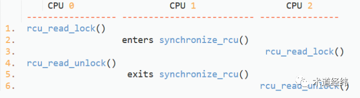 此外,在调用kfree()释放节点之前,多了一个synchronize_rcu()函数。synchronize就是「同步」,那它在和谁同步呢?就是前面说的那些“引用旧数据区的reader”啦,因为此时它们可能还在引用指针p。这相当于给了这些reader一个优雅退出的宽限区,因此这段同步等待的时间被称为Grace Period(简称GP)。不过,必须是在synchronize之前就已经进入critical section的reader才可以,至于之后的reader么,直接读新的数据就可以了,用不着writer来等待。比如下面这个场景中,作为writer的CPU 1只会等待CPU 0,CPU 0离开critical section后就结束同步,而不会理会CPU 2。也许,把synchronize_rcu()改名成wait_for_readers_to_leave()会更加直观。如果grace period的时间比较长,writer这么干等着,岂不是会影响这个CPU上更高优先级的任务执行?在这种情况下,可以使用基于callback机制的call_rcu()来替换synchronize_rcu()。void call_rcu(struct rcu_head *head, rcu_callback_t func);