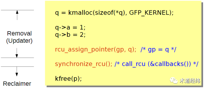 这里使用的是list_add_rcu(),而不是list_replace_rcu()来讲解,这是因为"delete"只需要synchronize_rcu()/call_rcu(),而"add"只需要rcu_assign_pointer(),它们都是最基础的操作,而"replace"完全可以视作是先进行"delete",再进行"add"的复合操作。理解了基础操作,复合操作就不在话下了。以grace period为界,整个更新操作被划分为了"removal"和"reclamation"两个阶段,writer的角色也被对应地划分为了updater和reclaimer。还是用链表操作的这个例子,removal阶段将一个节点从链表中移除,而等待所有reader解除对该节点的引用后,就进入回收/释放这个节点所占内存的reclamation阶段。因为writer在removal阶段就会解除对节点的引用,所以reader需要调用rcu_dereference()宏,将节点指针的值赋给一个临时指针,保存起来。它的实现可简单理解成这样:#define rcu_dereference(p) READ_ONCE(p);