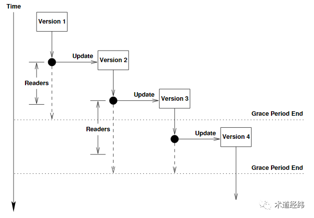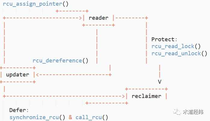 像上述代码这种退出临界区还在使用,是不行的。下图中的"p1"和"p2"分别代表reader保存的引用"data 1"和"data 2"的指针。虽然seqlock也可以实现reader和writer的并行,但在writer操作期间,reader的操作需要推到重来,所以其实是无效的。而在RCU中,reader和updater可以实现真正的并行,updater你更新你的,反正我reader读的是旧的数据。updater和reclaimer也可以并行,所以在某一时刻,一份数据可能有多个version(图中蓝色箭头表示“旧指针”,黑色箭头表示“新指针”)。但updater和updater之间不能并行,需要加spinlock来互斥。至于reader和reclaimer之间能不能并行,则取决于reclaimer对应的grace period是否包含相关的reader。从上文seqlock和本文RCU的实现来看,读取一侧其实都是没有锁的,reader和writer的同步在seqlock中靠的是sequence number,而在RCU中主要靠的是grace period。对于RCU,不能简单地说它是只支持“多读一写”还是支持“多读多写”的,但它但它通过对writer更细粒度的划分,确实比seqlock提供了更高的并行度。更高的并行度意味着能让更多的CPU处在busy的状态,也就能让硬件资源得到更充分的利用,提高效率。伴随着对RCU基本原理和使用方法的讲解,RCU中读取一侧和写入一侧5个基础的API其实也都逐步出现了,事实上,RCU的很多其他API都是基于这5个API组合而成的,就像红黄蓝三原色一样。由于writer角色和功能的划分,RCU中存在的是reader, updater和reclaimer三者之间的关联。借助下面这张图,我们可以一览RCU的全貌,同时梳理这些联系。以链表的"replace"操作为例,作为updater,在对copy的数据更新完成后,需要通过rcu_assign_pointer(),用这个copy替换原节点在链表中的位置,并移除对原节点的引用,而后调用synchronize_rcu()或call_rcu()进入grace period。因为synchronize_rcu()会阻塞等待,所以只能在进程上下文中使用,而call_rcu()可在中断上下文中使用。作为reader,在调用rcu_read_lock()进入临界区后,因为所使用的节点可能被updater解除引用,因而需要通过rcu_dereference()保留一份对这个节点的指针指向。进入grace period意味着数据已经更新,而这些reader在退出临界区之前,只能使用旧的数据,也就是说,它们需要暂时忍受“过时”的数据,不过这在很多情况下是没有多大影响的。作为reclaimer,对于所有进入grace period之前就进入临界区的reader,需要等待它们都调用了rcu_read_unlock()退出临界区,之后grace period结束,原节点所在的内存区域被释放。当内存不再需要了就回收,讲到这里,你有没有觉得,RCU的方法有点"Garbage Collection"(GC)的味道?它确实可以算一种user-driven的GC机制(区别于automatic的)。那reclaimer是如何知道这些reader都已经退出了读取一侧的临界区呢?这将在后续的文章中介绍。如果对本文的内容有什么疑问,可通过“阅读原文”在知乎上给我留言。