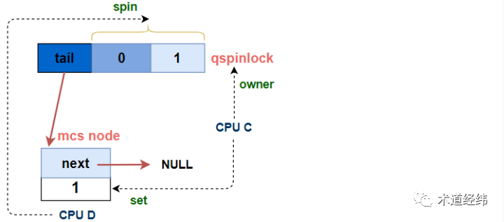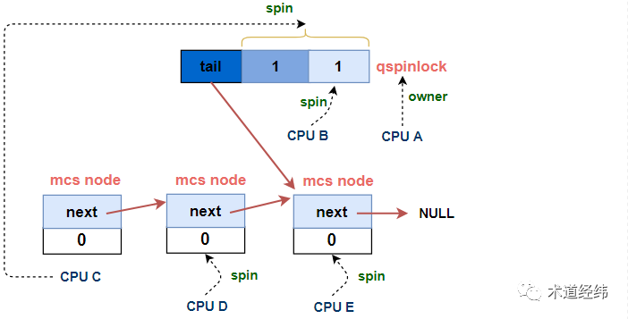 加入MCS node组成的队列后,这第N个CPU会基于自己node的"locked"进行spin,这就完全回到了上文描述的MCS lock的路径里了。