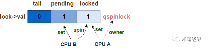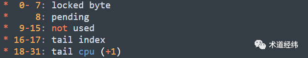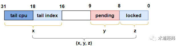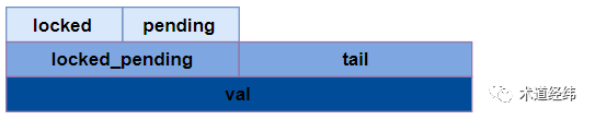 以32位系统为例,"val"作为一个32位的变量,包含了三个部分:"locked byte", "pending"和"tail","tail"又细分为"tail index"和"tail cpu":