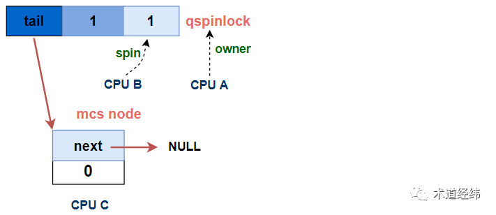 上文说到,MCS lock可以解决在锁的争用比较激烈的场景下,cache line无谓刷新的问题,但它内含一个指针,所以更消耗存储空间。但这个指针又是不可或缺的,因为正是依靠这个指针,持有spinlock的CPU才能找到等待队列中的下一个节点,将spinlock传递给它。本文要介绍的qspinlock,其首要目标就是把原生的MCS lock结构体进行改进,「塞」进4字节的空间里(以32位系统为例)。【MCS Lock的改进 - qspinlock】先来看一下有3个以上的CPU持有或试图获取spinlock时,等待队列的全貌: