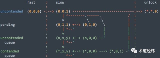 只需要把qspinlock中的"locked byte"置为0就可以了。后面一直有CPU盯着呢,一旦大位空缺,马上就有人补齐,您只需要乖乖地把位子腾出来就行。到这里,qspinlock加锁和解锁的过程就介绍完了,可以借助下面这张图片来一览它的全貌: