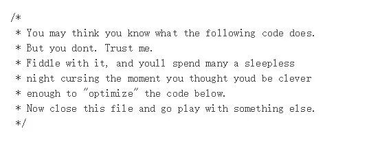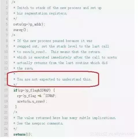 这是一段来自贝尔实验室的,第六版Unix Kernel,注释语句为“you are not expected to understand this”,意思就是,你不可能看懂这个。