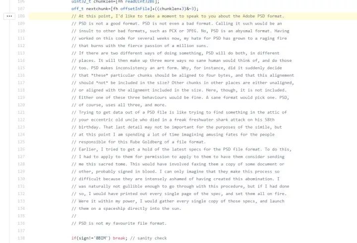 放个大招,在 GitHub 上有这么一个脚本,前面好好的,很正常,到了中间作者忽然用注释对 Adobe PSD 来了一大段的疯狂吐槽:
