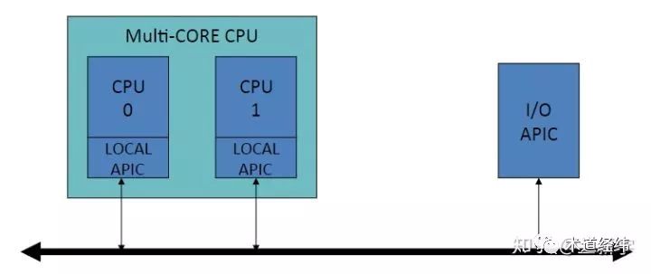 中断控制器是中断源和CPU之间的桥梁,自从CPU进入多核时代以后,中断控制器也慢慢地由单一的模块分化成了两个部分,一部分是直接连接中断源的,由所有的CPU共享,比如x86中的I/O APIC,另一部分是对接CPU的,其数目通常就等于CPU的数目,比如x86中的Local APIC。
