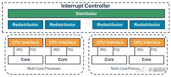 类似地,ARM的GIC也由Distributer和Redistributor两部分构成,其中Distributer类似于I/O APIC,其发挥的作用顾名思义,就是根据CPU的配置,将到来的中断源派发到CPU对应的Redistributor。Redistributor类似于Local APIC,它会将Distributer派发来的中断送到其连接的CPU。