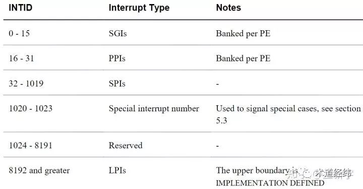 至于LPI就比较特殊了,它是从GICv3版本开始引入的,主要用于前面提到的message based的中断(MSI)。消息(message)是操作系统中一种常用的通信手段,硬件在中断系统中引入类似的实现机制,相比于传统的中断可以实现更灵活的设计。LPI的中断一定是MSI形式的,而SPI的中断可以是MSI,也可以不是。