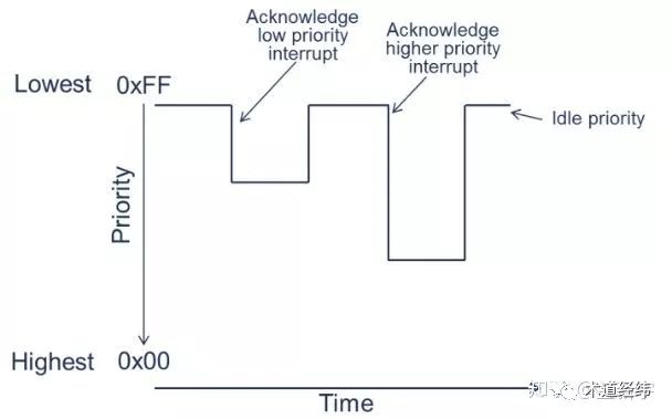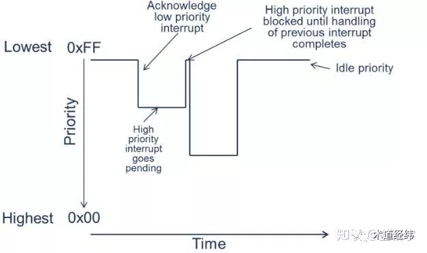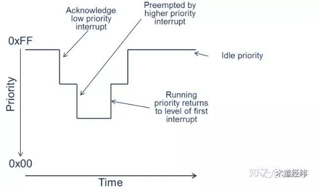 引入running priority的目的主要是为了解决中断抢占(preemption)的问题。假设不允许抢占,那么在低优先级的中断处理期间,高优先级的中断将被阻塞。