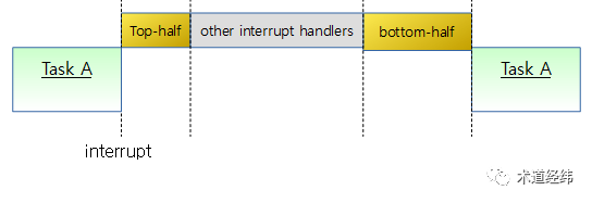 可是,如果关中断的时间长了,势必会影响对其他IRQ的响应,时间短了又处理不完。为此,上文提到的第二级的中断处理又被分成了两个部分,一个是俗称的“顶半部”(top half),在此期间,中断关闭,软件主要完成对硬件中断的应答,需要快速执行完毕。另一个与之对应的就是底半部”(bottom half) ,在底半部中,中断打开,内核继续完成在顶半部中未完成的中断处理。