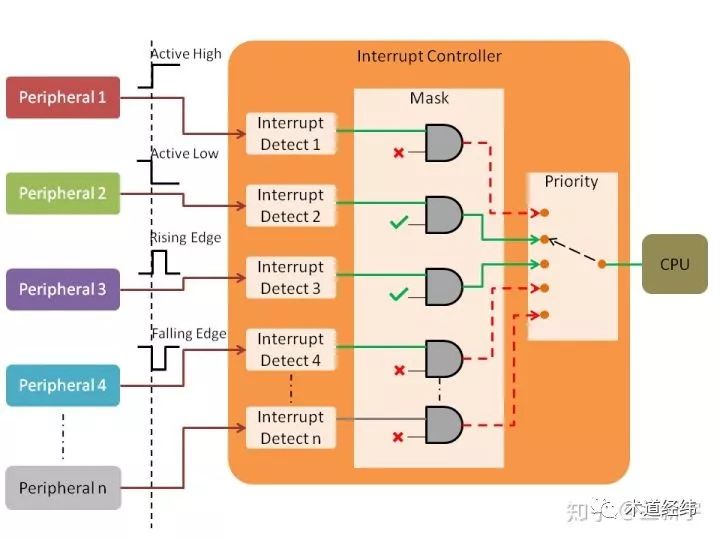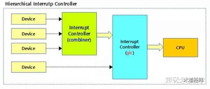 不管是外部中断还是内部中断,在它们到达CPU之前,都会首先经过一个叫做中断控制器(Interrupt Controller)的硬件,其作用是根据中断源(Interrupt Source,也叫IRQ - Interrupt Request)的优先级对中断进行派发。在多核系统中,中断控制器还需要根据CPU预先设定的规则,将某个中断送入指定的CPU(有点像路由器),以实现中断的负载均衡(irq balance)。x86架构的中断控制器被称为APIC(Advanced Programmable Interrupt Controller),ARM架构的中断控制器则被称为GIC(Generic Interrupt Controller),它们都是适用于多核系统的。